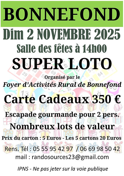 Le loto du foyer se déroulera le 2 Novembre 2025 à 14h00 à la salle des fêtes de Bonnefond